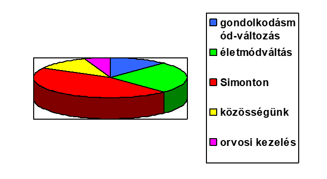 Ezt a változást minek tulajdonítja: gondolkodásmódbeli változás: 15 %, életmódváltás: 20 %, Simonton ismeretek: 40 %, közösség, amit kialakítottunk: 15 %, orvos 10 %